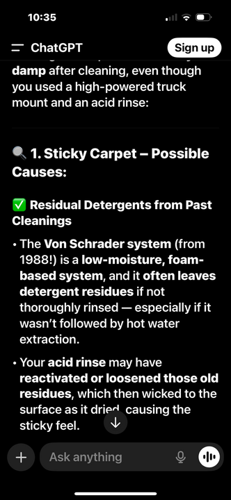 Anyway, I made the decision to just acid rinse at full heat 650psi to not disturb his health. He was very weak and skinny. Low and behold I get a callback 3 hours later and he told me his carpet is now sticky and still damp. I wanted to say, "that's what you get for doing that stupid VonSchrader 35-40 years ago!"