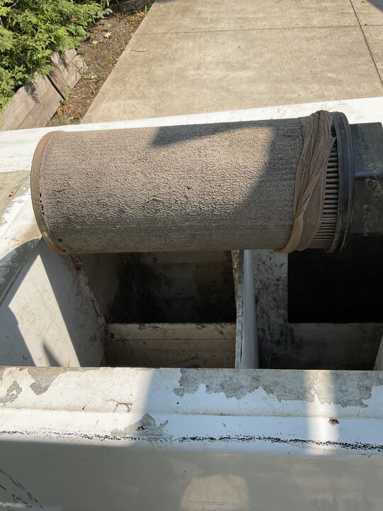 That titan had ZERO suction. What did I notice? The blower filter had a huge layer of dry sludge covering the blower filter!!!!! AND the blower belts were so loose, they couldn't be tightened any more. I was furious!!!! I had to go to the industrial store to buy some new belts, install them on the job, and pressure wash the blower filter off. His idiot brother, who was running the cc division of his business at the time, only cleaned out the basket filter.
