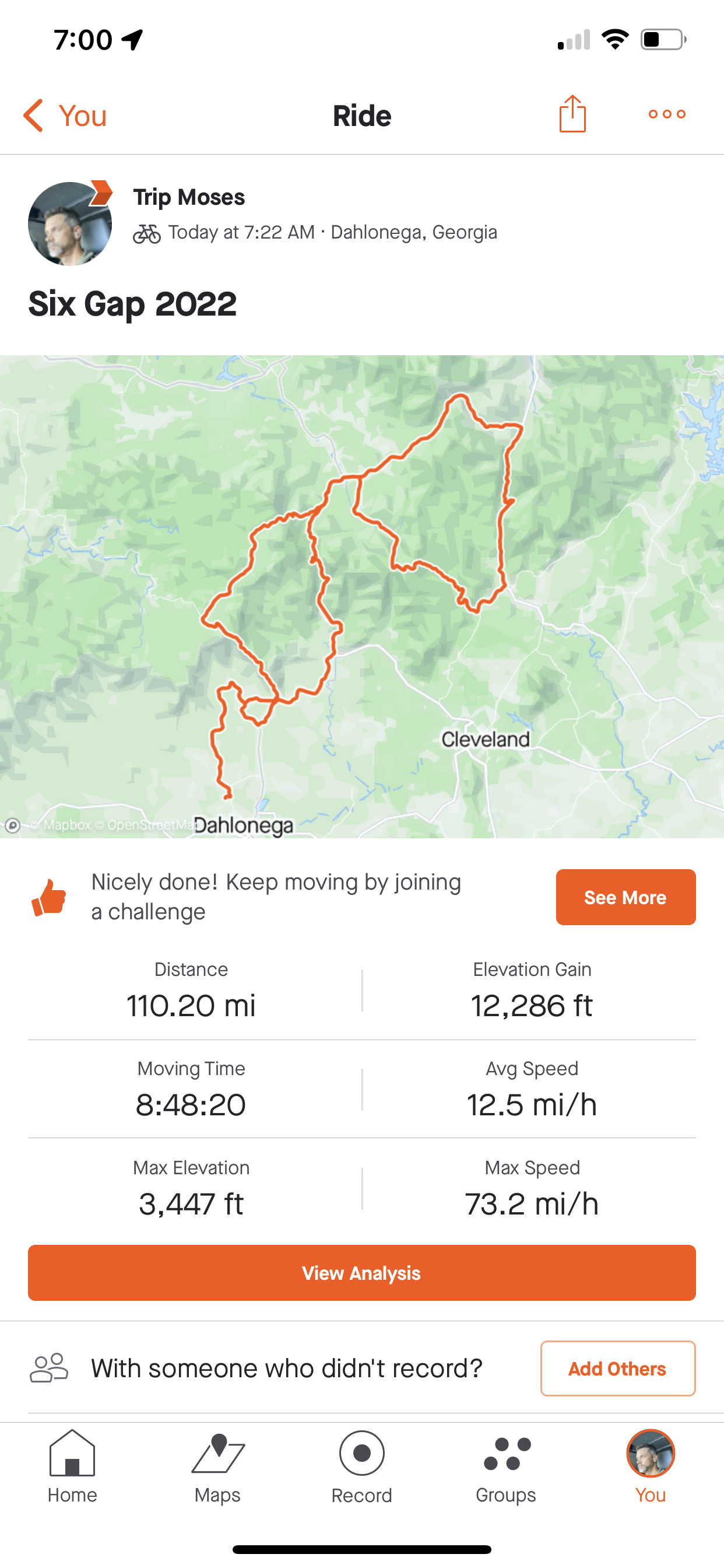 6 Gap. Riding my bicycle with 3,000 other cyclists, 12,500 fit of climbing, maybe that much downhill, 100 miles.