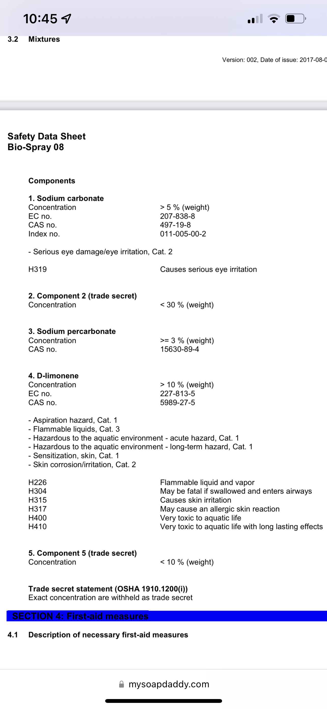 INGREDIENT DISCLOSURE: Pentasodium Triphosphate, Sodium Carbonate, Sodium Bicarbonate, Sodium Phosphate, C9-11 Alcohols Ethoxylated, d-Limonene, Sodium C10-16 Alkylbenzenesulfonate, Water, Sodium Sulfate, Myrcene, Alpha-Pinene, Protease Enzyme. All labels for products sold in California require an ingredient disclosure on the label and listed on your brand website. SDS only require listing products that contribute primarily to any hazards. You do not want doctors researching 10 raws when probably only 2 are primarily the reason for any hazards.Bio break.