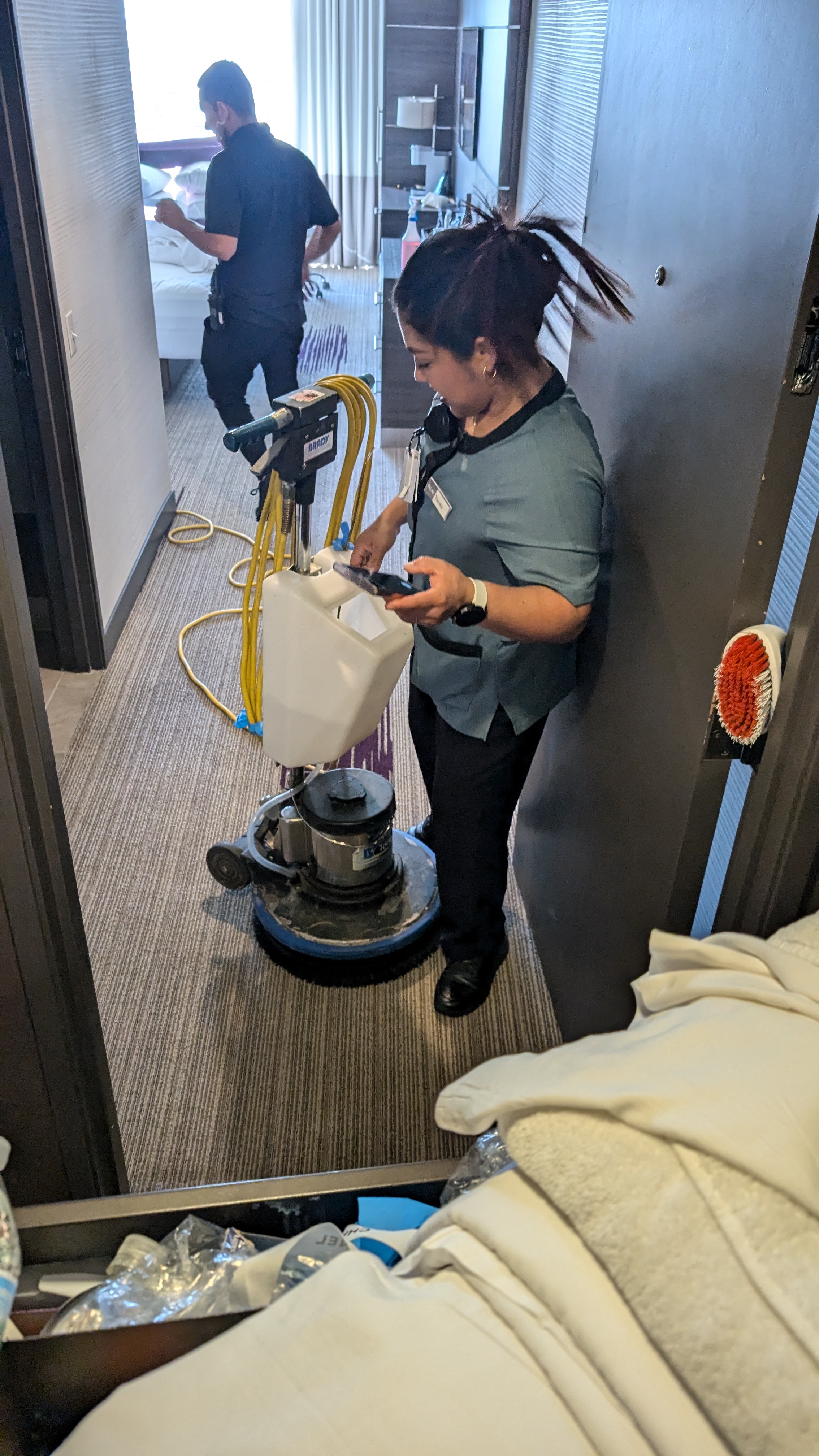 A floor machine and a cotton blend type pad to go over the area again to remove additional soiling and moisture may be beneficial as well. This last step process is known as “Post Padding”.