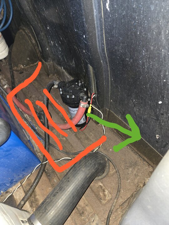To the right of my water box and behind the drivers seat, if I mount it vertically it would be out of the way and easy to access for service. I think a wooden base about 1.25" thick mounted off of the available area on the waste tank, and raised about .5" proud of the vertical surface of the waste tank so the lid can close... might do it. But the actual 1.25" wooden base running the full length of the heat exchanger. Seems like there is enough room for the coolant return hose to loop down under the ceiling, and the rest of the fittings would be easily accessible to the right of the water box underneath the heat exchanger. What do you think?