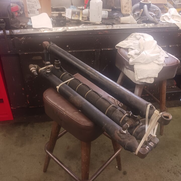 They're actually not that big they stand about as tall as the blower and are around 10" in diameter first one pre heats the soulition and the second one heats hotter. Both the coolant side and solution sides are in series so the hotter solution going out is heated by the hotest coolant coming in and the coolest soulition coming in is preheated by the coolant returning to the engine the original steamgeni heat exchangers was a bundle of 3 tube and shell (like the one youre replacing) their problem was they couldn't handle the pressures necessary for tile cleaning ill take a picture of the bundle tomorrow to show you what im talking about