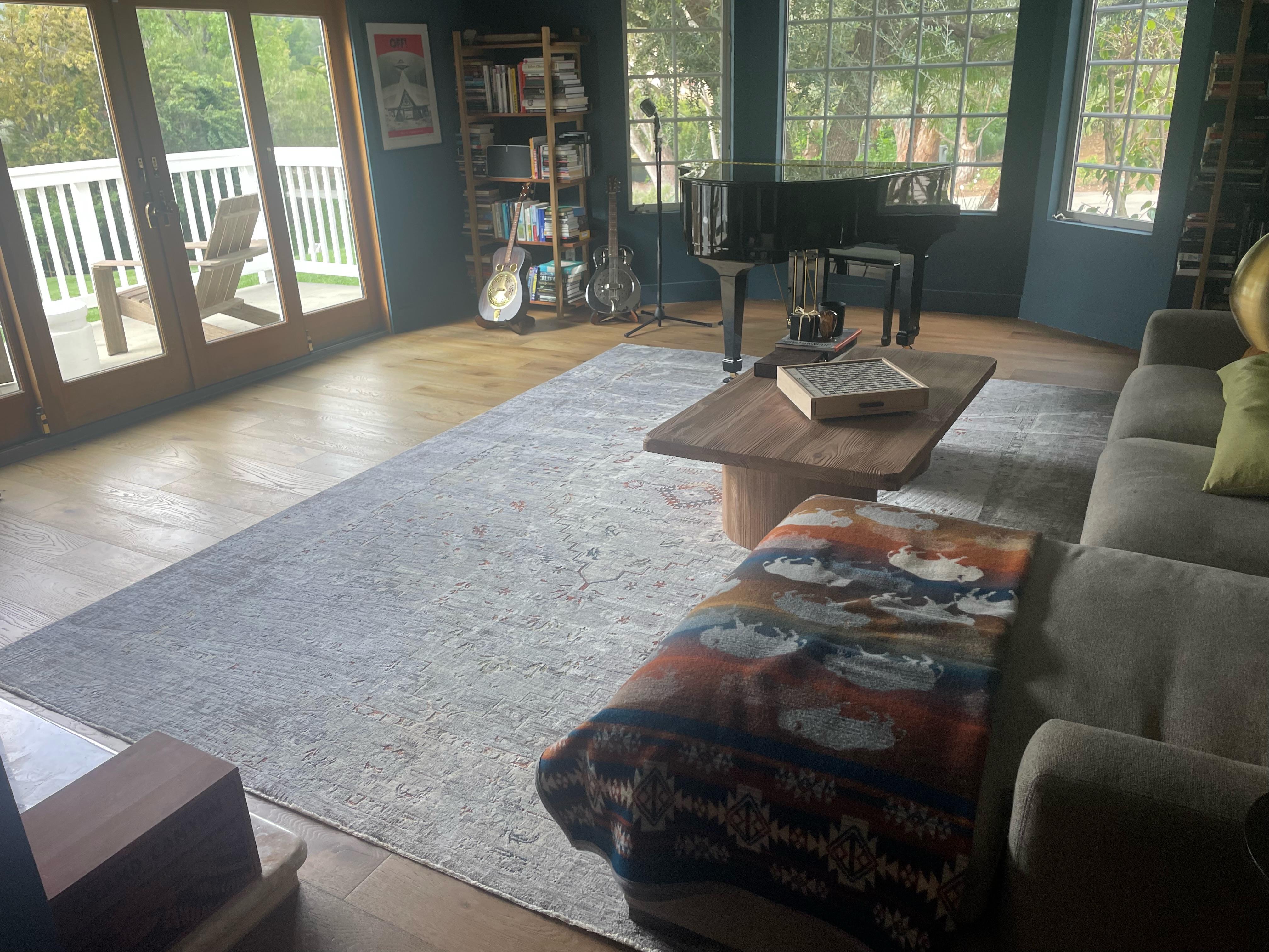 Actually, a grand piano is easy to get a rug out from under by yourself. I'll tell you how if you really want to do this.