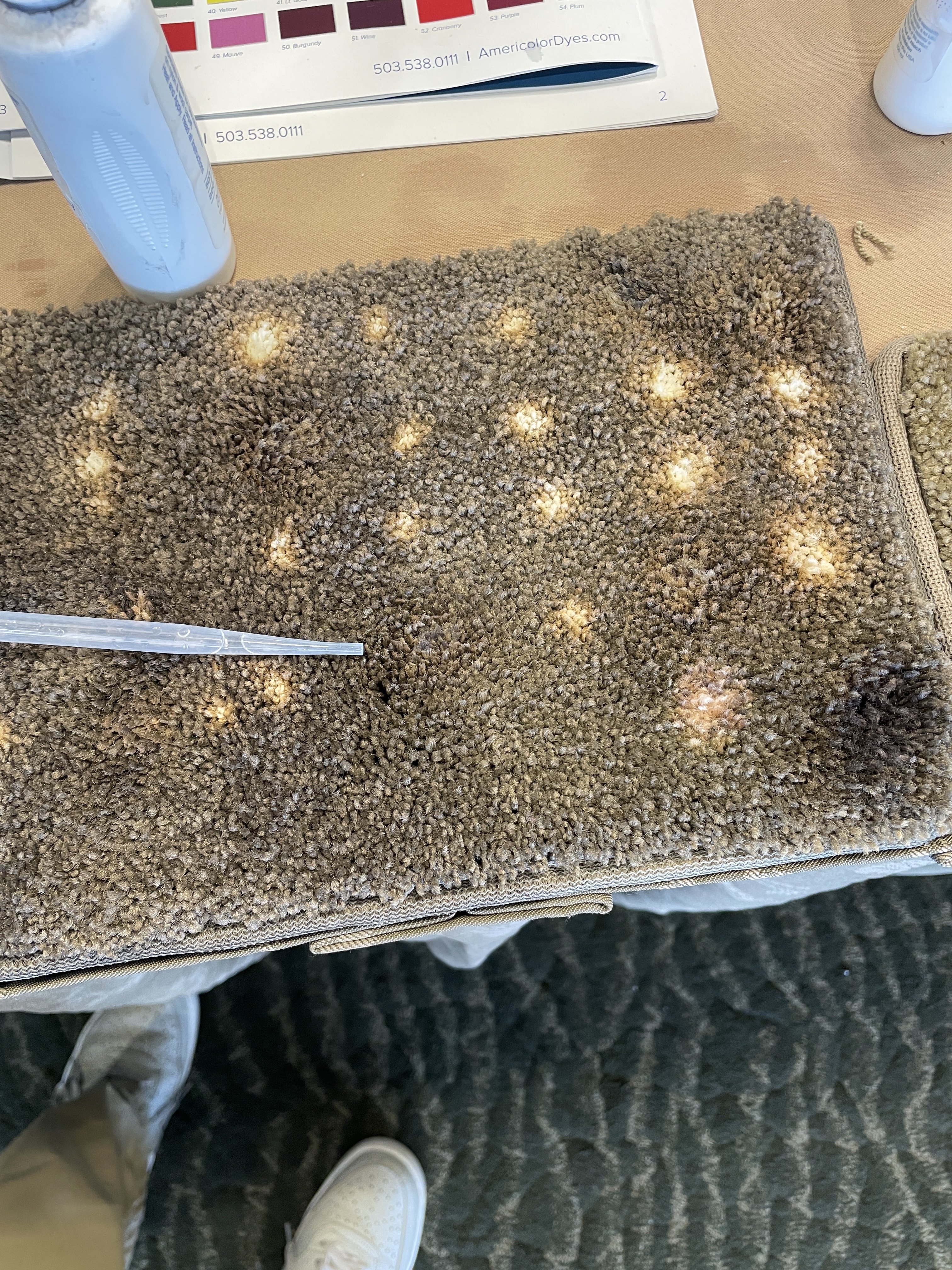 So Melody David, Americolor taught me how to dye carpet. The carpenter had a darker shade and a lighter shade on his truck than what I would have used, and we went darker in this case because it "Camos" in with the knots.