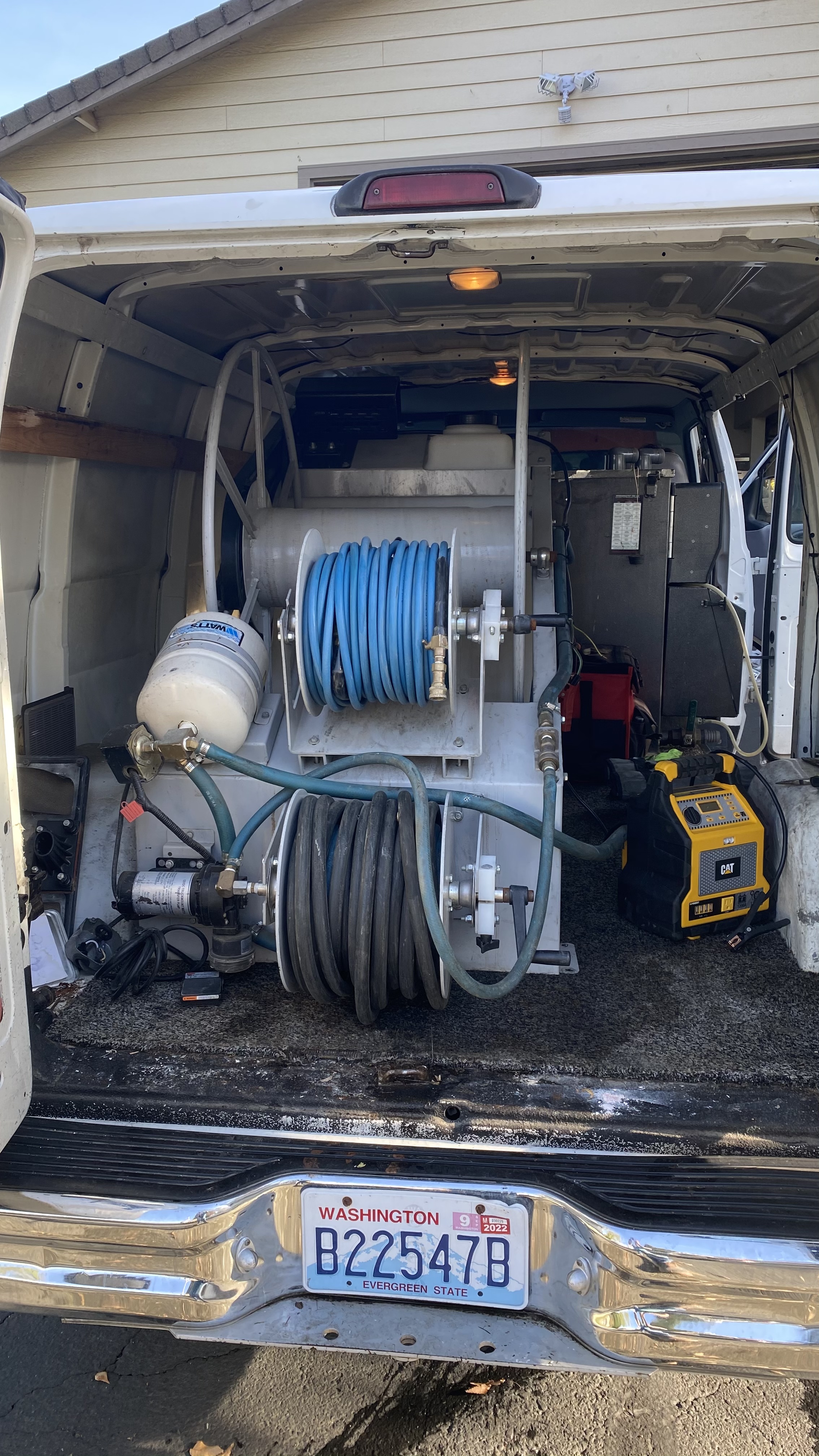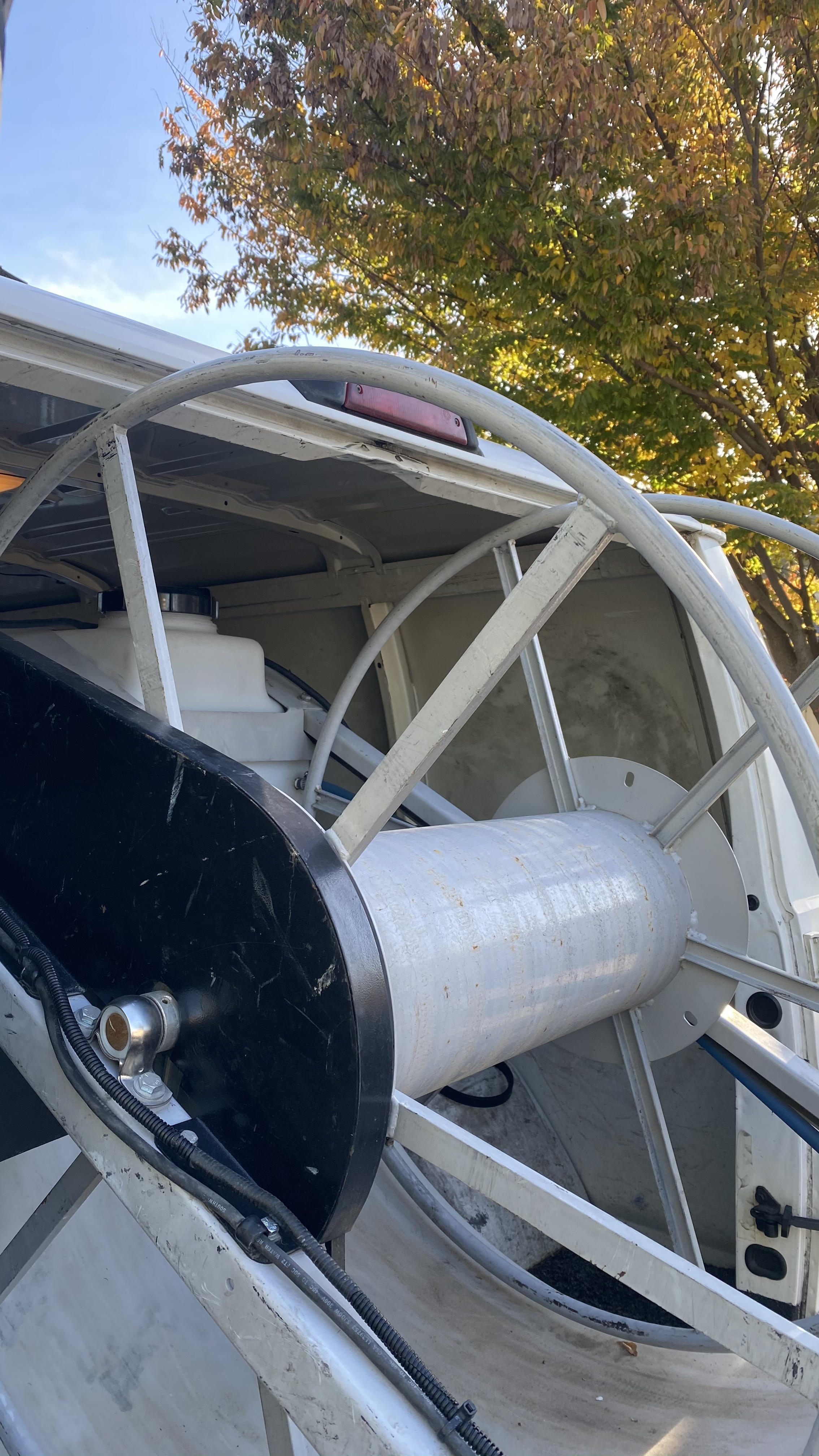 Well, I'm taking a lunch break. I have been working on the van all morning. Got the Reel bolted down along with the chem shelf. After lunch I'll work on wireing her up.