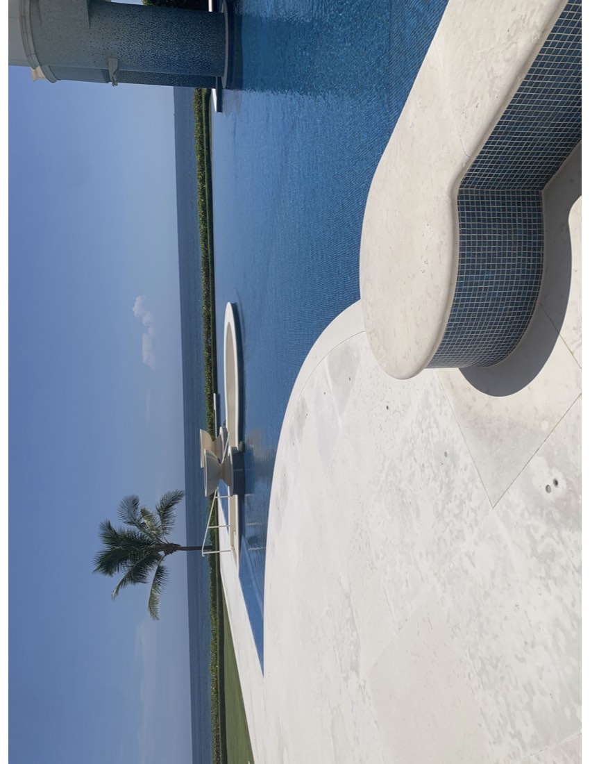 It's honed (ultra porous) and outside on the coast, by a pool.
